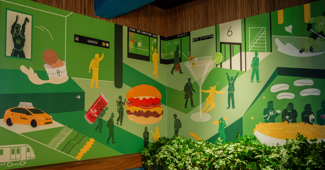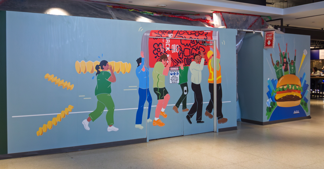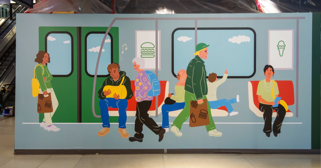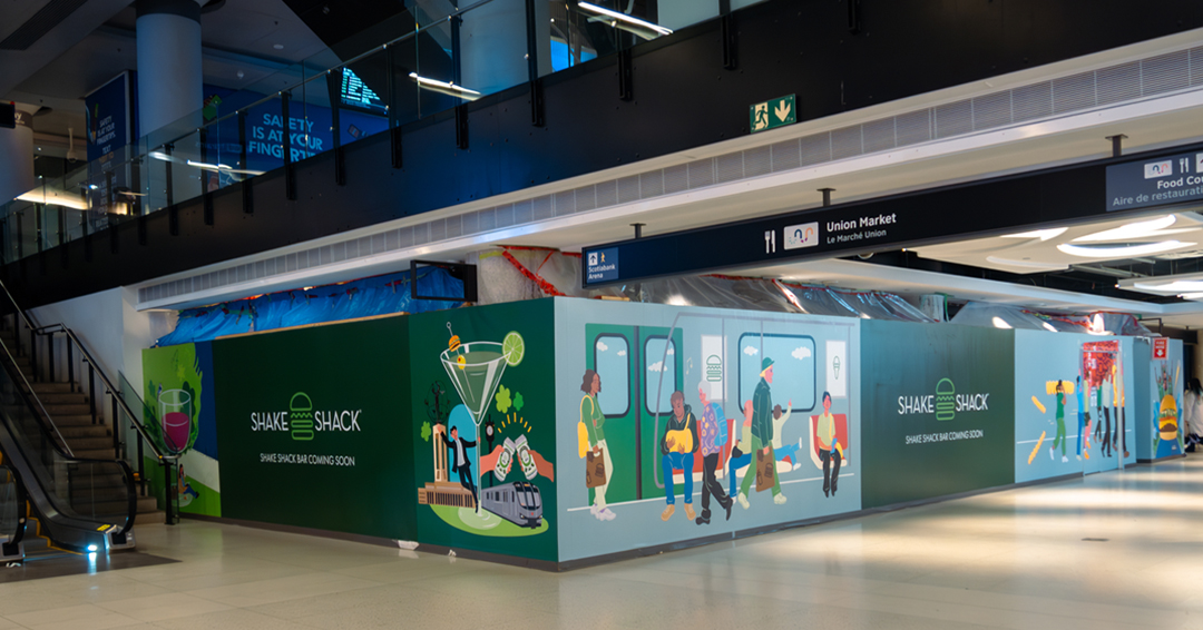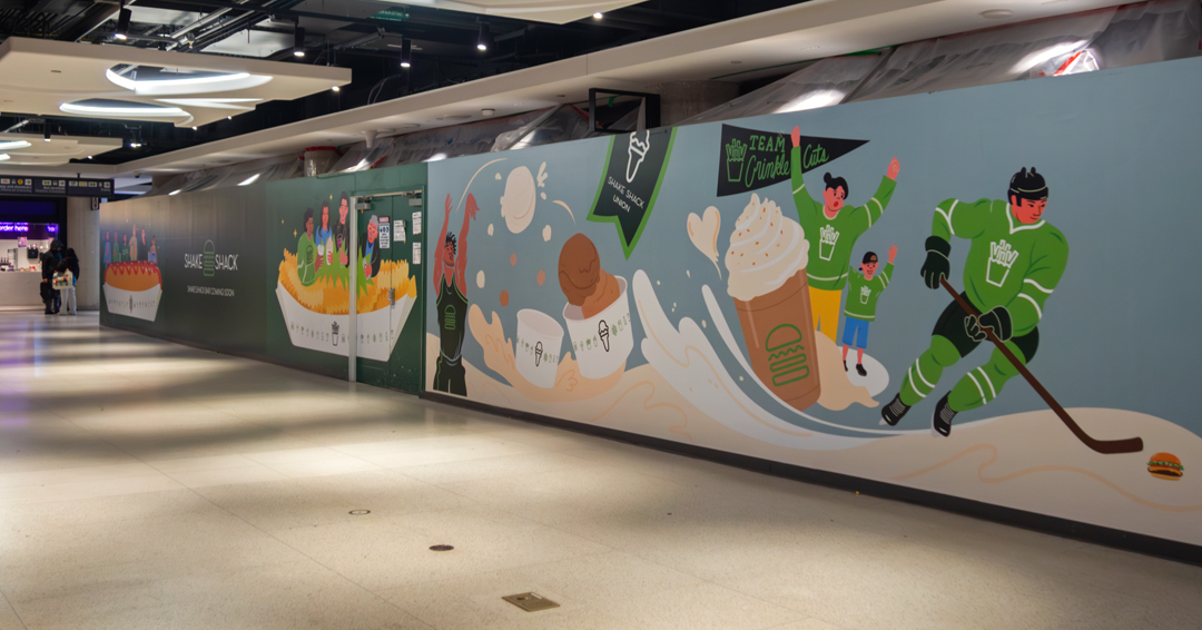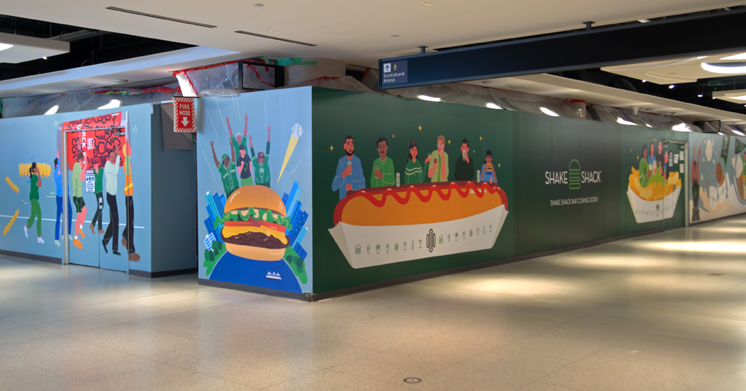 For the hoarding, the illustrations show people interacting with the Shake Shack food and drinks in different setttings, such as on the subway, nearby Rogers Centre, or mirroring the Union Station Foodie Aisle area.
