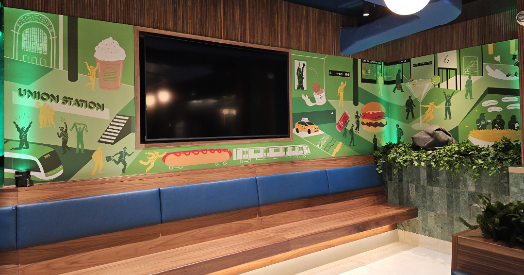 For the wall mural, I wanted to show the different parts of Union Station, as a transportation hub and as a place for people to gather, in a chaotic way. There are shops, shortcuts, and sports venues nearby. The station layout has always been confusing for people to navigate, and full of liminal spaces.
